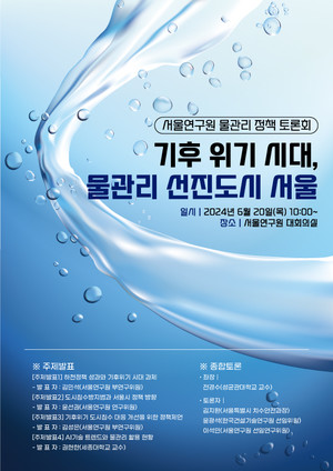 [풋볼리스트] 황명철 기자= 서울연구원(원장 오균)은 20일(목) 오전 10시 서울연구원 대회의실에서 ‘기후 위기 시대, 물관리 선진도시 서울’이라는 주제로 물관리 정책 토론회를 개최한다. 이번 토론회는 기후변화로 인해 빈번해지는 홍수와 가뭄 등 기후위기에 대응해 서울시가 물관리 분야에서 선도적인 역할을 할 수 있는 방안을 모색하는 것이 목적이다.토론회는 △오균 서울연구원 원장의 개회사를 시작으로 △김민석 서울연구원 부연구위원의 ‘하천정책 성과와 기후위기 시대 과제’ 주제발표 △윤선권 서울연구원 연구위원의 ‘도시침수방지법과 서울시