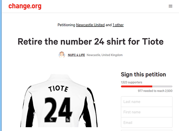 [풋볼리스트] 류청 기자= 지난 5일 훈련 도중 심장마비로 숨진 셰이크 티오테 번호인 24번을 영구결번 시키자는 뉴캐슬 팬들의 청원운동이 온라인상에서 벌어지고 있다.