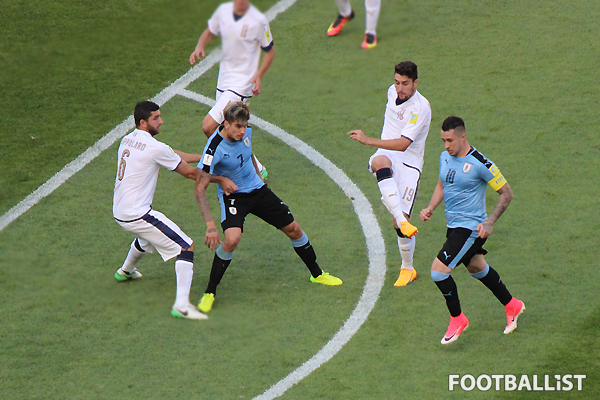 이탈리아는 라인을 한껏 낮추고 수비를 탄탄히 했다. 우루과이는 후반에 승부를 띄웠다. 풀백의 전방 가담률을 높이고, 중원의 발베르데, 벤탄쿠르, 비에라가 적극적으로 최전방을 도왔다. 우루과이는 90분간 무려 24회의 슈팅을 쏟아 부었다. 이탈리아가 같은 시간 동안 불과 6회의 슈팅을 기록한 것에 비하면 4배에 가까운 수치다.