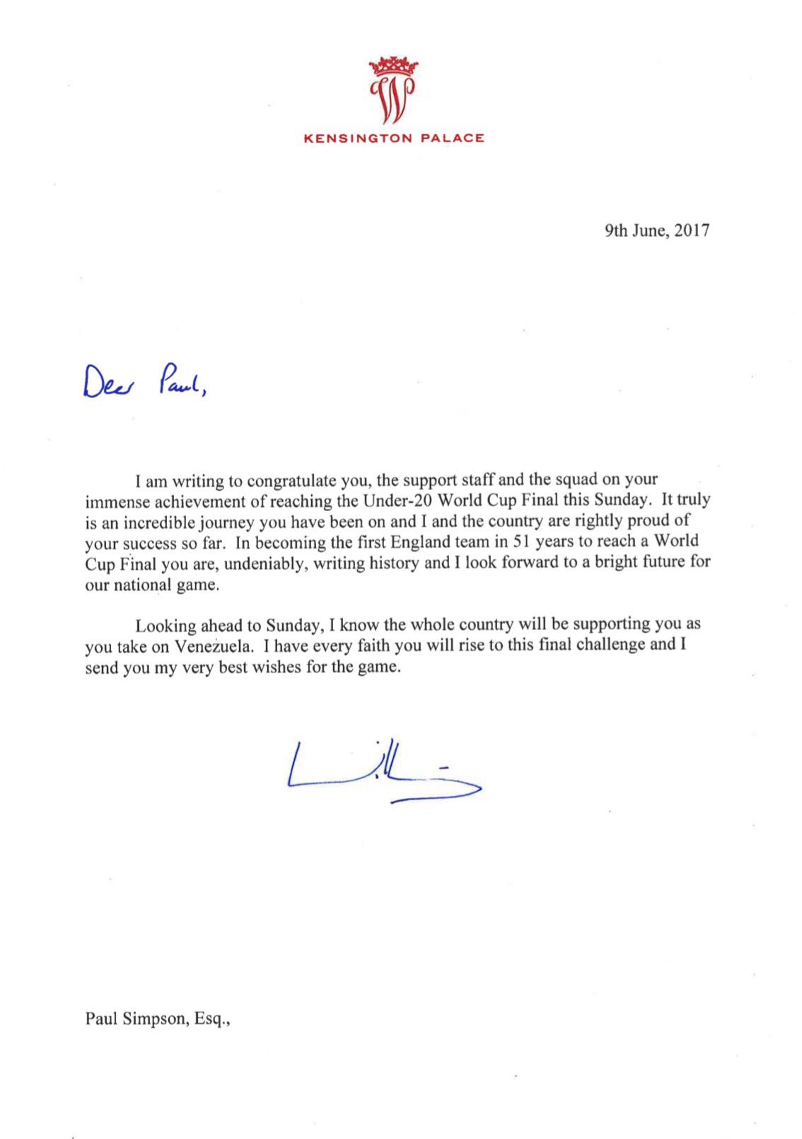 여기에 잉글랜드 축구협회장인 윌리엄 왕세손도 결승전을 앞두고 폴 심슨 감독과 선수단에게 긴급 전보를 보냈다. 윌리엄 왕세손은 결승 진출 축하 메시지와 함께 “스쿼드와 팀을 지원하는 모든 스태프들이 일구어 낸 성과에 대해 축하의 말을 전한다”며 “믿기지 않는 성과를 내고 있다. 온 나라가 자랑스러워 한다. 역사를 새롭게 쓰고 있으며, 국기(축구)의 밝은 역사를 썼다”고 찬사를 보냈다. 선수들과 스탭 모두가 큰 힘을 얻었다는 후문이다.