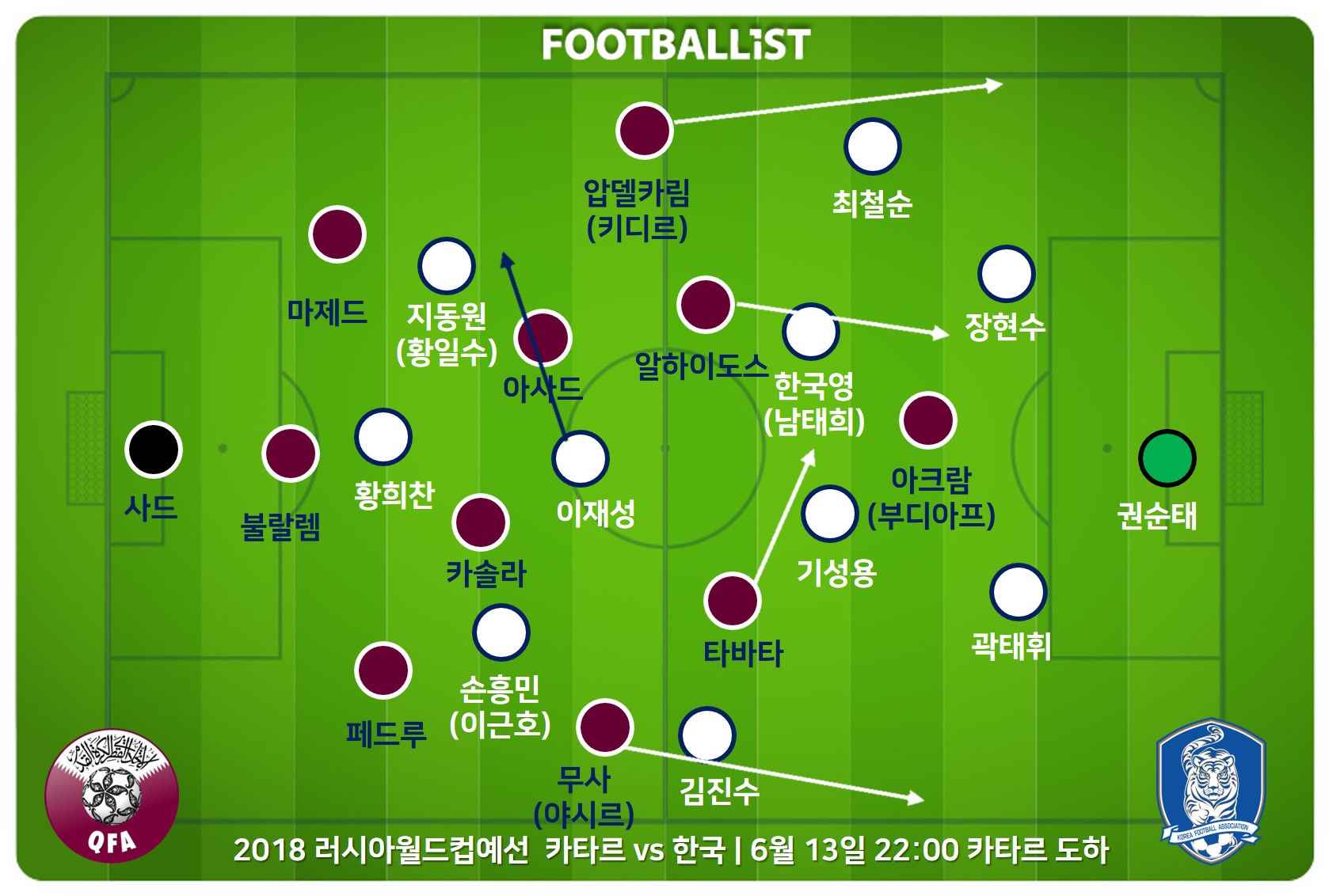 이라크전에 스리백을 실험했던 슈틸리케 감독은 황희찬을 원톱으로, 이재성을 공격형 미드필더로 배치한 4-2-3-1 포메이션으로 나섰다. 오히려 최종예선 들어 줄곧 포백을 유지하던 카타르가 3-4-3 포메이션으로 나와 한국을 어려움에 빠트렸다.