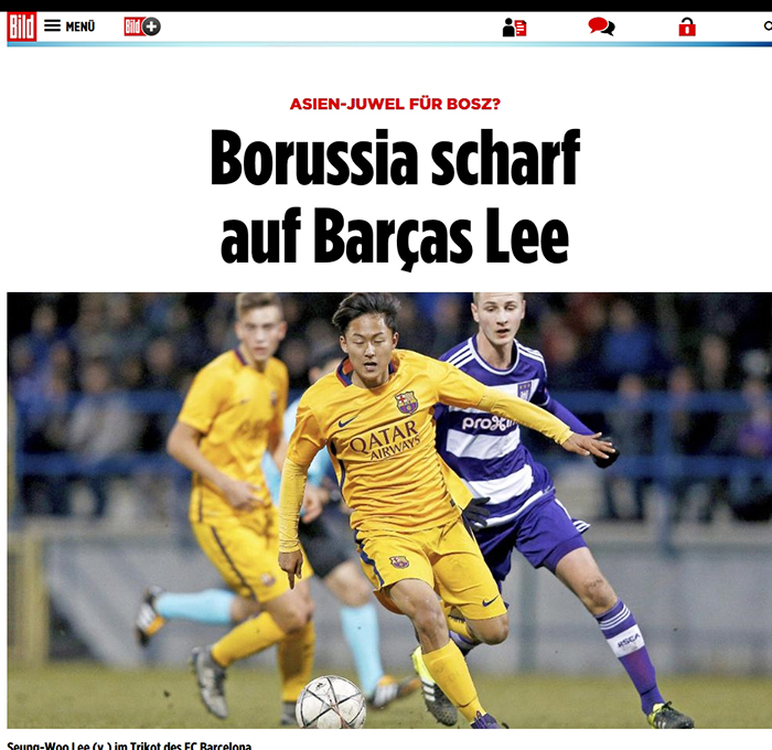 [풋볼리스트] 한준 기자= 독일 신문 ‘빌트’가 보루시아도르트문트와 공격수 이승우(19, FC바르셀로나 후베닐A)를 연결했다. "도르트문트가 아시아 시장 공략을 위해 한국의 '슈퍼탤런트' 이승우 영입에 관심을 갖고 있다"는 내용의 보도다.