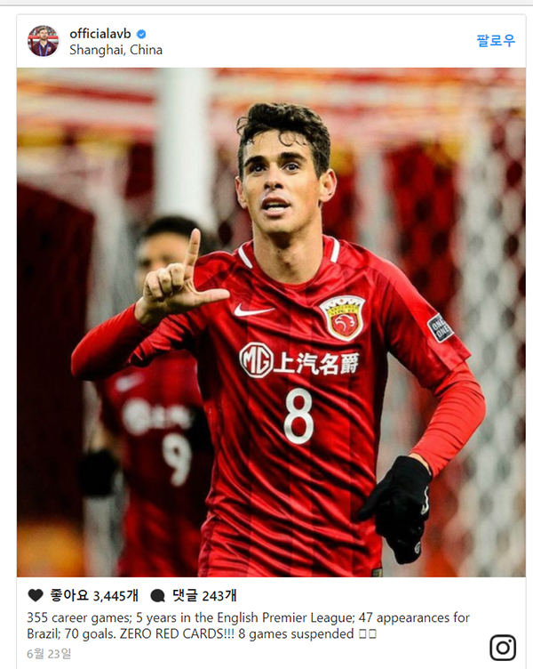 빌라스-보아스 감독은 인스타그램 계정에 오스카 사진을 올렸다. 그 밑에 ‘355경기 출전, 잉글리시프리미어리그에서 5년, 브라질 대표팀 소속으로 47경기, 총 70골. 레드 카드는 없다! 8경기 출전정지’라고 썼다. 프로 데뷔 이후 퇴장 한 번 당하지 않았던 오스카에 무리한 징계를 내렸다며 우회적으로 불만을 드러낸 것이다.