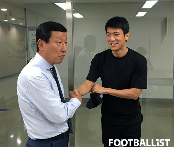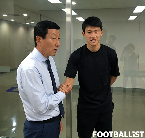 2일 서울 월드컵경기장에서 열린 'KEB 하나은행 K리그 클래식 2017‘ 18라운드 경기에서 전북이 FC서울에 1-2로 패배했다. 이날 경기를 앞두고 선수들이 워밍업을 하고 있을 때, 사전 인터뷰까지 마치고 혼자 남겨진 최 감독에게 검은 색 티셔츠를 입은 청년이 쭈뼛거리며 다가왔다. 한교원이었다.