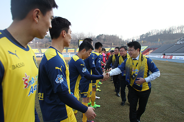 복 시장 역시 축구를 사랑하는 조기회에게 아산 축구 부흥을 위해 힘을 쏟아달라고 당부했다. “제가 축구하는 분들에게 그랬어요. 전국에 이런 사례가 있는지 모르겠지만 우린 아산시축구협회장을 구단 대표로 임명했다. 이 팀을 당신들 것으로 만들어달라는 강한 메시지거든요. 당신들이 조기축구만 하지 말고 여기 와서 같이 응원하고 하지 않으면 축구가 살아남을 수 없다는 메시지에요. 그에 대해 관계자들이 잘 인지하고 있는 것 같고, 이 팀이 그냥 자기 선수들 개인 관리만 하는게 아니고 우리 시민들과 흡수되서 같이 하는 팀, 그렇게 운영되었으면 하는 바람을 갖고 있어요.”