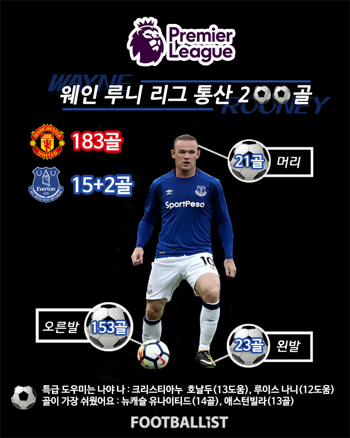 [풋볼리스트] 김완주 인턴기자= 에버턴의 스트라이커 웨인 루니가 EPL통산 200호 골을 터뜨렸다. 크리스티아누 호날두(레알마드리드), 루이스 나니(발렌시아) 등 특급 도우미들과 함께 한 기록이다.