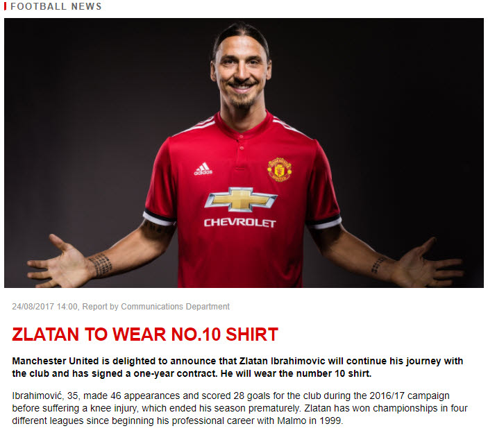 맨유는 24일 홈페이지를 통해 즐라탄의 계약을 발표했다, 계약 기간은 1년, 등번호 10번이다.