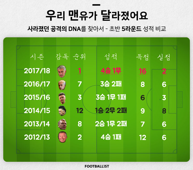 맨유는 2012/2013 시즌을 끝으로 알렉스 퍼거슨 감독이 은퇴한 후 네 시즌 동안 불안한 시즌 초반의 모습을 보여줬다. 5라운드 기준 가장 순위가 높았던 것은 2015/2016시즌이었다. 당시 맨유는 3승 1무 1패를 기록했다. 하지만 골득실에서는 6득점 3실점으로 다소 부진했다. 퍼거슨 감독의 마지막 시즌 5라운드 기준 득점은 12득점이었다. 하지만 이후 데이비드 모예스 감독, 루이스 판 할 감독을 거치며 10득점 이상을 기록한 것은 단 한 차례도 없었다.