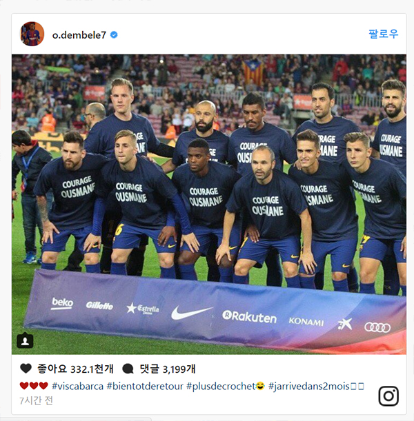 부상 당사자인 뎀벨레는 복귀 시간을 줄이고 싶다. 그는 지난 20일(이하 현지시간) 인스타그램 계정에 동료들이 ‘우스만 힘내(Courage Ousmane)’라고 적힌 옷을 입고 경기 전 촬영하는 모습을 게시한 뒤 “두 달 안에 돌아오겠다(J’arrive dans 2 mois)”라는 문구를 썼다. 재활 기간을 반으로 줄이고 싶다는 이야기다.