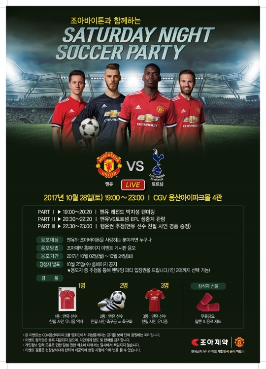 맨유의 공식 파트너인 조아제약은 29일 보도자료를 통해 오는 10월 28일 오후 8시 30분부터 서울 용산역 아이파크몰에 위치한 CGV영화관에서 맨유와 토트넘의 경기를 함께 관전하는 행사 Saturday Night Soccer Party’ 이벤트를 진행한다고 밝혔다.