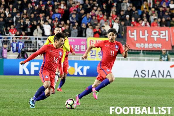 좌우 중 오른쪽 공격이 확실했다. 오른쪽을 맡은 권창훈과 최철순은 측면 공격을 전문으로 하는 선수들이 아니지만, 중앙 미드필더 고요한과 공격수 이근호가 계속 오른쪽으로 빠지며 순간적으로 오른쪽 측면 자원이 4명으로 불어나는 효과를 냈다. 한국의 첫 골은 이근호의 패스가 권창훈을 맞고 연결됐고, 두 번째 골은 고요한이 밀어준 걸 최철순이 스루패스해서 어시스트가 나왔다. 모두 오른쪽이었던 건 우연이 아니었다. 좌우 측면 중 한 쪽이라도 확실히 공략하는 비대칭 구성이 효과를 냈다.