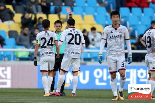 전반 44분 사건이 터졌다. 상주의 주장인 미드필더 여름이 중앙선 부근에서 한석종과 경합을 벌이다 발바닥으로 상대 다리를 걷어차는 꼴이 됐다. 바로 앞에서 지켜본 고형진 주심이 퇴장을 선언했다.