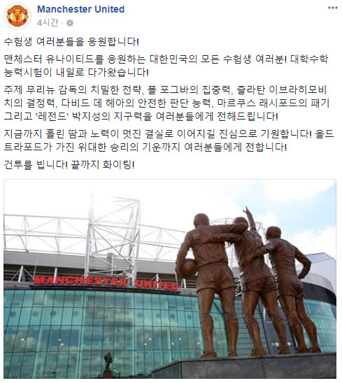 잉글랜드 프리미어리그의 명문 구단들이 대한민국의 수험생들을 응원하는 메시지를 보냈다. 맨체스터유나이티드(이하 맨유), 리버풀, 맨체스터시티(이하맨시티) 등은 23일 공식 소셜네트워크 채널을 통해 각자 재치 넘치는 메시지를 보냈다.