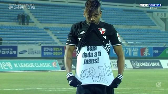 [픗볼리스트=상주] 김완주 기자= 부산아이파크의 외국인 공격수 레오는 특별한 세리머리를 준비하고 상주 원정에 동참했다. 故 조진호 감독을 위한 세리머니였다.