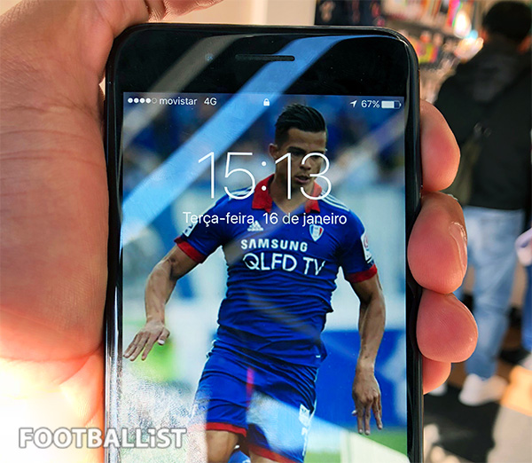 [풋볼리스트=카디스(스페인)] 16일(한국시간) 스페인 카디스에서 ‘풋볼리스트’와 인터뷰를 가진 조나탄이 휴대전화 배경화면 속 수원삼성 시절 사진을 보여주고 있다. 조나탄은 지난해 수원 소속으로 K리그 클래식 22골을 넣어 득점왕을 차지했고, 올해 톈진테다로 이적했다.