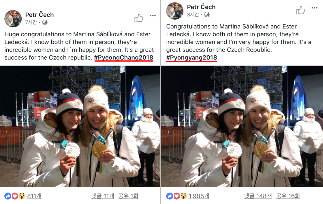 [풋볼리스트] 김동환 기자= 아스널의 골키퍼 페트르 체흐가 자신의 SNS에 평창올림픽을 평양올림픽으로 잘못 기재했다가 한국 팬들의 지적을 받고 수정하는 해프닝이 펼쳐졌다.