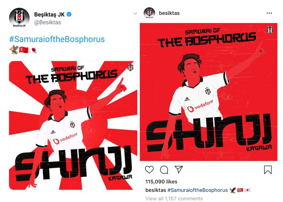 임대생의 불꽃 활약에 기뻤던 베식타슈는 경기 후 트위터, 인스타그램 등 SNS를 통해 가가와의 이미지를 게시했다. ‘보스포루스의 사무라이’라는 설명도 더해졌다. 터키 보스포루스 지방을 찾아온 가가와를 향한 반가움이 담긴 메시지였다.