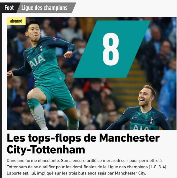 이들은 손흥민이 전반에만 2골을 넣으며 팀이 4강으로 가는데 도움을 준 것을 높이 평가했다. 토트넘은 이날 3-4로 패하고 1.2차전 합계에서도 4-4로 비겼으나 원정다득점우선원칙에 따라 4강에 올랐다.