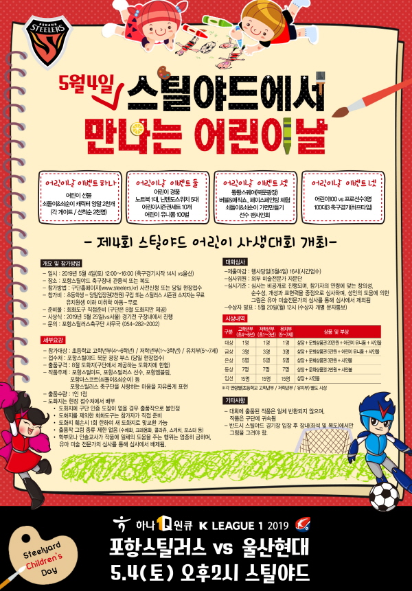 포항은 4일 오후 2시 스틸야드에서 울산현대와 맞붙는다. 어린이날을 하루 앞두고 펼쳐지는 주말 홈 경기를 맞이해 어린이를 비롯한 가족단위 팬심 잡기에 나섰다. 우선 홈경기 시작 2시간 전인 낮 12시부터는 ‘제4회 스틸야드 어린이 사생대회’가 개최된다. 당일 경기 장면을 비롯해 선수, 엠블럼, 스틸야드, 구단 마스코트 쇠돌이와 쇠순이 등 포항스틸러스를 사랑하는 마음을 자유롭게 표현하면 된다. 제출된 작품은 외부 미술전문가 자문단의 심사를 거쳐 수상자를 선정한다. 각 부별로 대상부터 입선까지 수상자를 선정하며 대상에게는 문화상품권 20만원, 어린이 유니폼, 사인볼 등 푸짐한 상품과 부상이 주어진다.