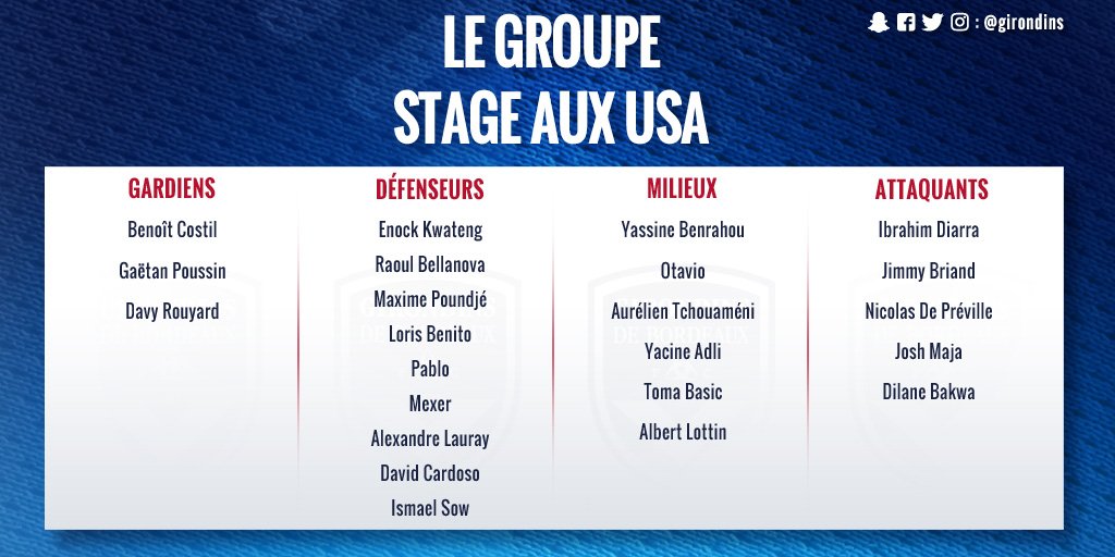보르도는 15일(이하 현지시간) 미국 워싱턴DC에서 열리는 친선대회에 참가할 선수 23명을 발표했다. 파울루 수자 감독과 선수들은 16일 비행기를 타고 워싱턴으로 날아갈 예정이다.