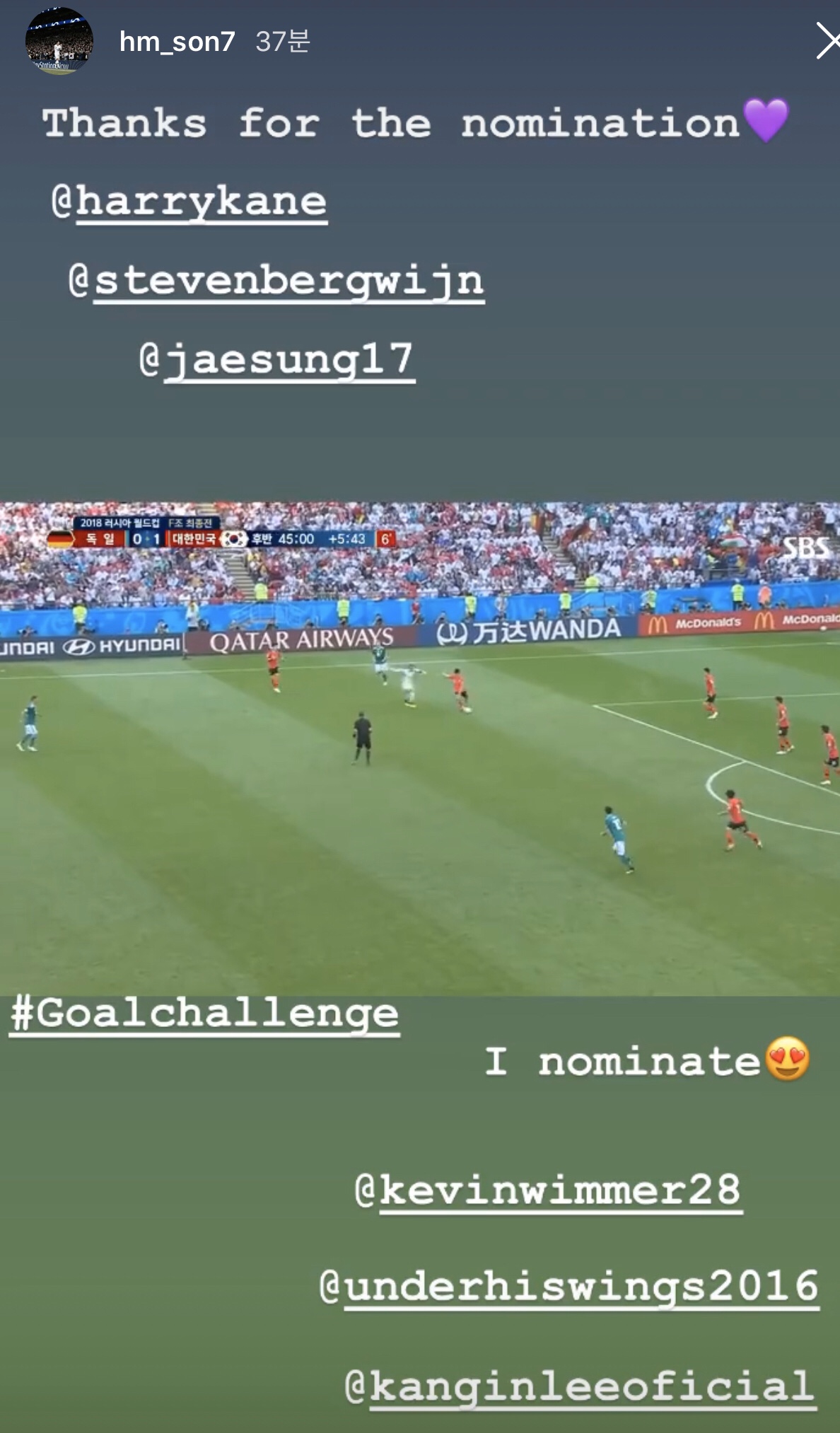 손흥민은 이 영상과 함께 영어로 "지목해 준 해리 케인, 베르흐베인, 이재성에게 감사한다"는 글과 함께 해쉬태그로 '골 챌린지' #Goalchallenge 참여를 밝힌 뒤, 다음 주자로 토트넘 팀 동료였던 '절친' 케빈 비머, 대표팀 전 주장 기성용, 대표팀 막내 이강인을 지목해 눈길을 끌었다.