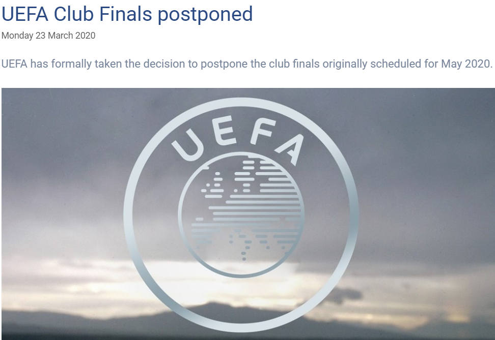 이미 유로2020 본선을 1년 연기하기로 결정한 UEFA는 23일 알렉산더 체페린 회장 주재로 열린 컨퍼런스에서 3개 클럽 대회 결승전의 연기를 확정했다. 올 시즌 UEFA 챔피언스리그 결승전은 5월 30일 터키 이스탄불에서, 여자 챔피언스리그 결승전은 5월 24일 오스트리아 비엔나에서, 유로파리그 결승전은 5월 27일 폴란드 그단스크에서 각각 열릴 예정이었다.