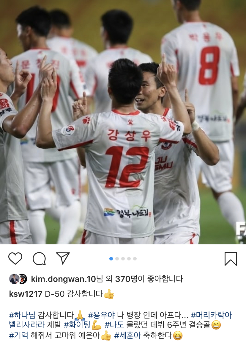 강상우는 포항 팬들에게 조금 이른 인사를 전했다. 상주 팬들에게 받은 사랑과 고마운 기억을 갖고, 이제 원소속팀으로 돌아갈 준비도 해야 한다. “포항 팬 분들! 제가 돌아갈 날이 얼마 남지 않았습니다. 상주에서 많이 배운 만큼 더 성장한 좋은 선수, 좋은 사람으로서 찾아뵙겠습니다. 많이 응원해주셨으면 좋겠습니다.”