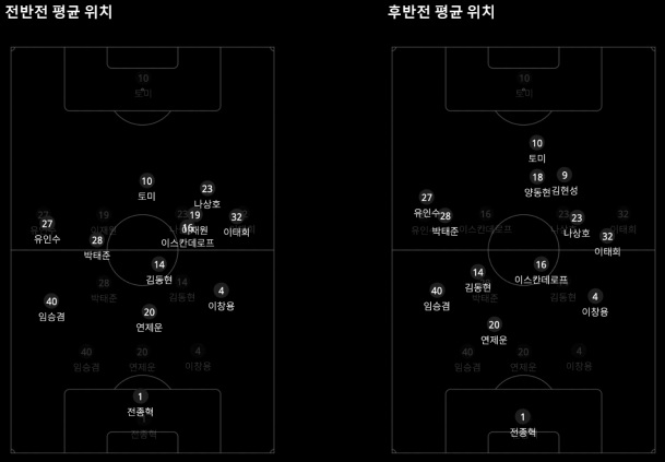 스리백 중 한 명이 전진하면 김동현 등 미드필더가 후퇴, 다시 스리백 형태를 만든 다음 공을 뿌리는 것도 특이한 패턴이다. 오른쪽 스토퍼 이창용도 기대 이상의 롱 패스 정확도로 배급에 일조한다.
