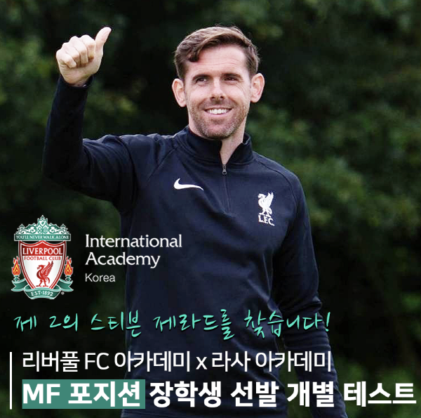 [풋볼리스트] 김동환 기자= 한국 리버풀 FC아카데미의 중∙고등부 엘리트 선수 육성기관인 라사 아카데미는 지난 GK, DF 포지션 장학생 선발 테스트에 이어 미래의 리버풀 중원 사령관을 꿈꾸는 미드필더 유망주들을 발굴∙육성하기 위해 전국 초등학교 6학년부터 고등학교 1학년까지를 대상으로 중∙고등부 MF 포지션 장학생 선발 비공개 테스트를 실시한다고 밝혔다.