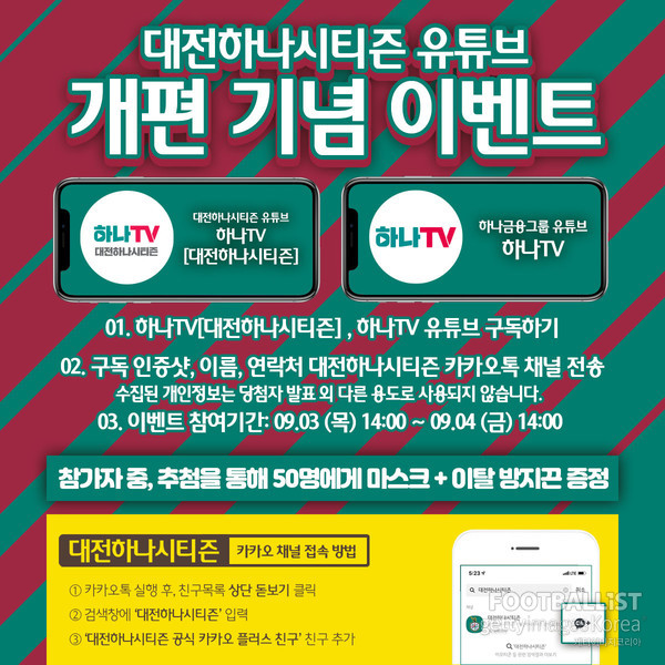 대전은 유튜브 개편을 기념해 구독 인증 경품 이벤트를 실시한다. 이벤트 참가 방법은 대전하나시티즌 공식 유튜브 채널인 ‘하나TV [대전하나시티즌]’와 하나금융그룹 유튜브 채널인 ‘하나TV’ 구독 인증샷을 대전하나시티즌 공식 카카오톡 채널을 통해 이름, 연락처와 함께 발송하면 된다. 이벤트 참여 기간은 9월 3일부터 9월 4일 오후 2시까지이며 추첨을 통해 50명에게 구단 공식 마스크 및 이탈 방지끈을 선물로 증정한다.