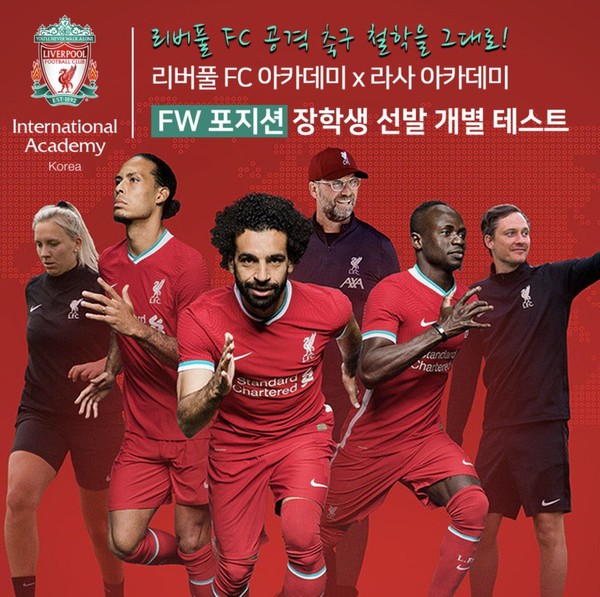 [풋볼리스트] 김동환 기자= 한국 리버풀 FC아카데미의 중∙고등부 엘리트 선수 육성기관인 라사 아카데미가 전국 초등학교 6학년부터 고등학교 1학년까지를 대상으로 중∙고등부 FW 포지션 장학생 선발 비공개 테스트를 실시한다.