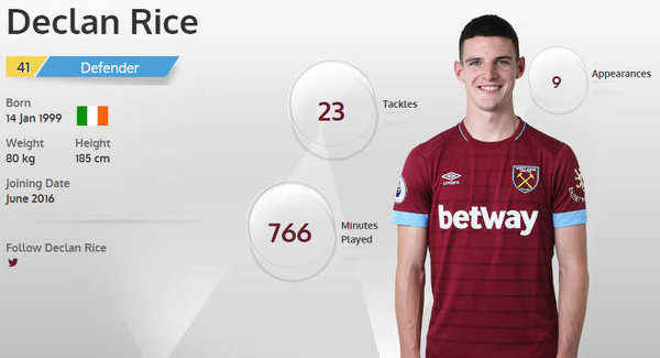 라이스는 2006년부터 2014년까지 첼시 유스팀에서 활약했다. 이후 웨스트햄으로 이적해 프로 데뷔에 성공한 뒤 주전 멤버로 활약 중이다. 작년부턴 잉글랜드 대표팀에서도 중용됐다. 램파드 감독은 지난 시즌부터 라이스에게 관심을 드러낸 것으로 알려졌다. 9,000만 파운드(약 1,353억 원)라는 높은 몸값이 가장 큰 걸림돌이다.