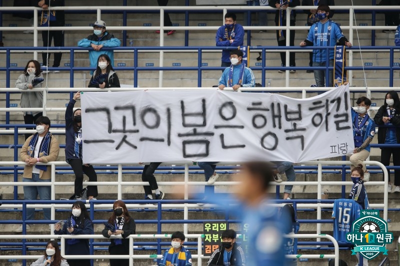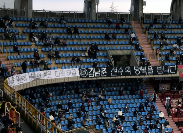 1일 K리그1 경기가 열린 전주 월드컵경기장, 울산 문수축구전용구장, 포항 스틸야드에 각각 김남춘을 추모하는 걸개가 걸렸다.