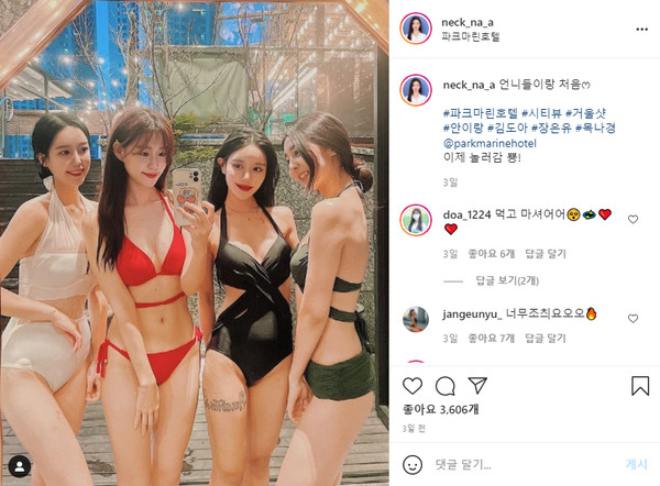 목나경은 자신의 인스타그램을 통해 한 호텔 수영장에서 포즈를 취한 사진을 게시했다. "언니들이랑 처음", "이제 놀러감 뿅"이라는 글과 함께 게재된 사진 속에서 4인방은 각자의 매력을 발산하고 있다.
