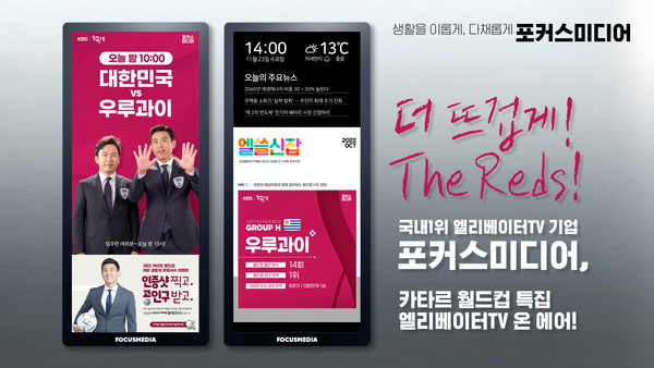 [풋볼리스트] 김동환 기자= 엘리베이터TV 기업 '포커스미디어코리아'가 KBS와 함께 '2022 FIFA 카타르월드컵' 기간 동안 대한민국 선수단과 우리나라가 속한 H조 정보, 경기 일정 등 월드컵 관련 영상 콘텐츠를 제작해 엘리베이터TV로 송출한다.