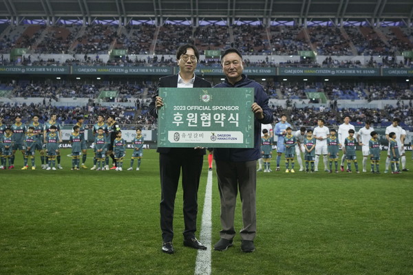 대전하나시티즌과 FC서울의 ‘하나원큐 K리그1 2023’ 5라운드 경기에 앞서 유성갈비 이태준 대표와 대전하나시티즌 허정무 이사장이 참석한 가운데 후원 협약식이 열렸다.