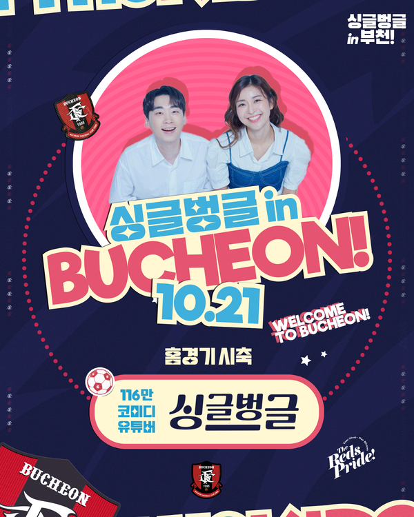 부천은 오는 10월 21일 토요일 오후 4시 부천종합운동장에서 펼쳐지는 FC안양(이하 안양)과의 홈경기에 유튜브 크리에이터 ‘싱글벙글’의 김두현, 이유미를 특별 시축자로 초청했다. 경기 전 시축 행사를 통해 부천의 승리를 기원하고, 부천 팬과 시민들을 만나 경기를 관람한다.
