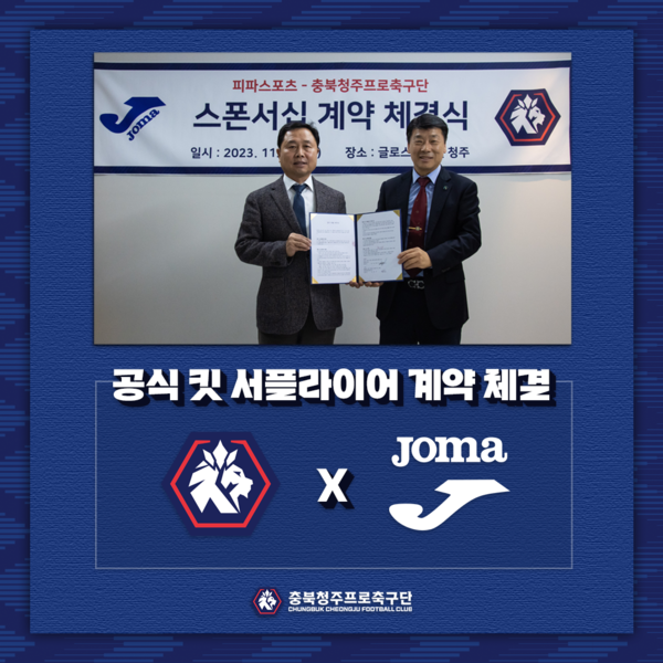 [풋볼리스트] 김동환 기자= 충북청주프로축구단이 스페인 스포츠용품 브랜드 조마와 함께 2024시즌을 맞이한다. 충북청주는 조마와 공식 킷 서플라이어 계약을 체결하면서 향후 2년간 조마의 유니폼을 입고 경기에 나선다.