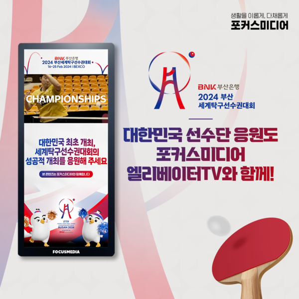 [풋볼리스트] 황명철 기자= 국내 1위 엘리베이터TV 운영사인 커뮤니케이션 컴퍼니 포커스미디어코리아가 'BNK 부산은행 2024 부산세계탁구선수권대회'의 파트너사로 선정되어 성공적인 개최를 응원하는 엘리베이터TV 캠페인을 2월 25일까지 진행한다.