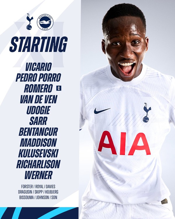 경기 시작을 1시간 앞두고 토트넘이 선발 명단을 공개했다. 히샤를리송이 원톱으로 출격하고 티모 베르너, 제임스 매디슨, 데얀 쿨루세프스키가 2선을 지원한다. 파페 마타르 사르와 로드리고 벤탄쿠르가 중원을 구성하고 데스티니 우도기, 미키 판더펜, 크리스티안 로메로, 페드로 포로가 수비라인을 구축하고 굴리엘모 비카리오가 골문을 지킨다.