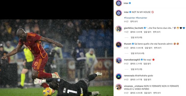 인테르 공격수 마르쿠스 튀람은 웃는 이모지와 함께 “인스타 관리자가 무슨 말을 하는지 잘 알겠다”고 댓글을 남겼다. 팬들은 답글로 튀람을 향한 애정 표현을 보냈다. 작년 여름 합류해 루카쿠를 대체하고 있는 튀람은 이날 동점골을 터뜨리고 경합 상황에서 상대 자책골을 이끌어내 역전승의 일등 공신으로 활약했다.