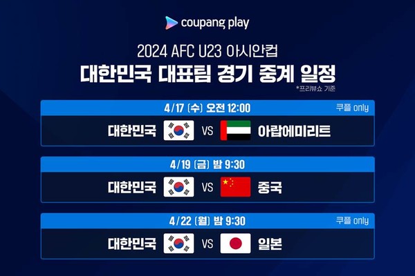 [풋볼리스트] 김동환 기자= 쿠팡플레이가 오는 15일부터 카타르에서 개막하는 ‘2024 AFC U23 아시안컵(이하 U23 아시안컵)’의 대한민국 대표팀 경기를 포함한 전 경기를 생중계한다. 특히, 17일 대한민국과 아랍에미리트의 조별리그 1차전과 22일 한일전은 쿠팡플레이에서만 독점으로 디지털 중계한다.