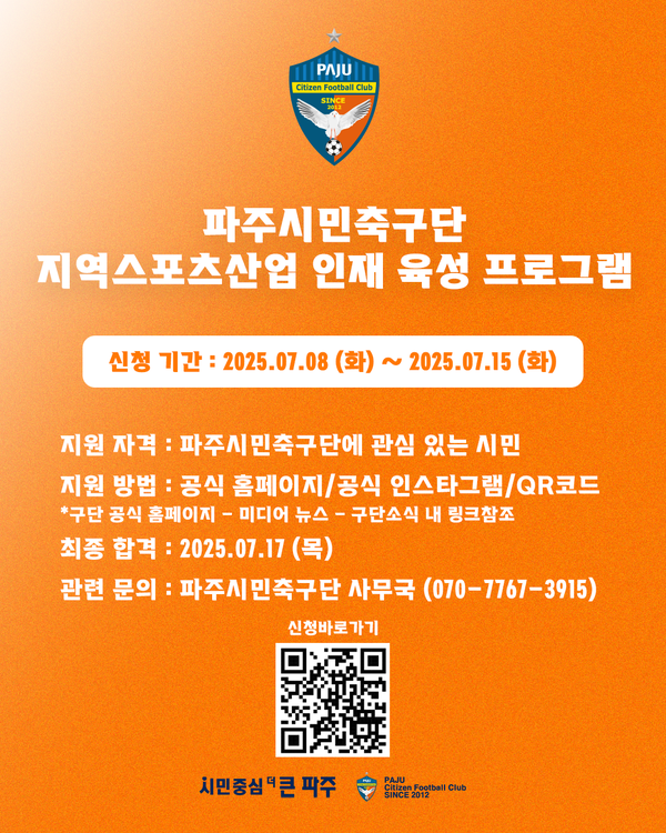 지원 자격은 파주시민축구단에 관심 있는 시민이면 참가 가능하며, 참가 신청은 공식 홈페이지 구단 소식, 공식 인스타그램, QR코드 바로가기, 신청서 바로 작성하기를 참고하면 된다.