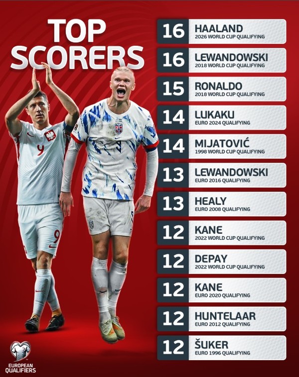 16골은 유럽에서 진행된 메이저 대회 예선 역사상 최다골 타이 기록이다. 기존 기록은 2018 러시아 월드컵 예선에서 폴란드의 로베르트 레반도프스키가 보유하고 있었다. 그 뒤를 크리스티아누 호날두의 15골(2018 월드컵 예선, 포르투갈), 로벨루 루카쿠(유로 2024 예선, 벨기에)와 프레드라그 미야토비치의 14골(1998 월드컵 예선, 유고슬라비아)이 이었다. 레반도프스키(유로 2016 예선), 데이비드 힐리(유로 2008 예선, 아일랜드)의 13골, 해리 케인(2022 월드컵 예선과 유로 2020 예선, 잉글랜드), 멤피스 더파이(2022 월드컵 예선, 네덜란드), 클라스얀 훈텔라르(유로 2012 예선, 네덜란드), 다보르 수케르(유로 1996 예선, 크로아티아)의 12골도 상위권에 있다.