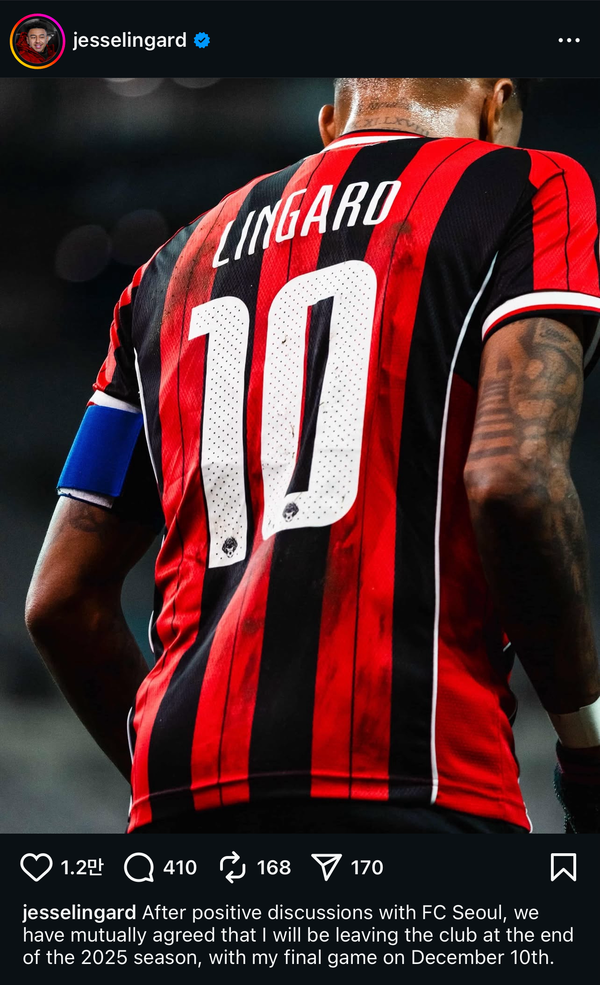 [풋볼리스트] 김희준 기자= 올해를 끝으로 FC서울을 떠나는 린가드가 팬들에게 작별 인사를 남겼다.