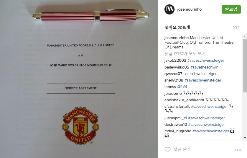 무리뉴 감독은 맨유 입단이 임박했을 무렵 인스타그램 계정을 개설했다. 이후 첫 포스팅으로 맨유와의 계약서를 공개하며 SNS세상에 화려하게 등장했다. 약 10주 동안 47개의 게시물을 남겼고, 1백만명 이상의 팔로어를 획득했다. 맨유에서의 생활은 물론 휴가, 아들과의 시간 등 일상에 관한 게시물이 큰 인기를 끌었다.