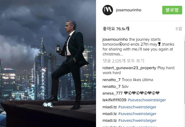 무리뉴 감독은 지난 커뮤니티실드 경기를 앞두고 자신의 인스타그램을 통해 “여행이 시작된다. 그리고 5월 27일에 끝난다. 크리스마스에 다시 만나자”라고 남겼다. 당시에는 SNS 중단 선언인지 알려지지 않았지만, 이후 현지 매체와의 인터뷰를 통해 중단이 확인됐다.