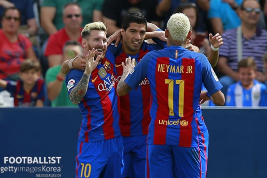 메시와 호날두의 득점왕 대결은 시즌 내내 벌어진다. 메시가 앞서나갔다. 메시는 20일(한국시간) ‘2016/2017 UCL' C조 2차전 홈 경기에서 3골 1도움으로 맨체스터시티를 4-0으로 대파했다. 지난 시즌까지 동료였던 맨시티 골키퍼 클라우디오 브라보가 후반 8분 퇴장 당했고, 그 뒤로 바르셀로나가 3골을 몰아쳐 승리했다.