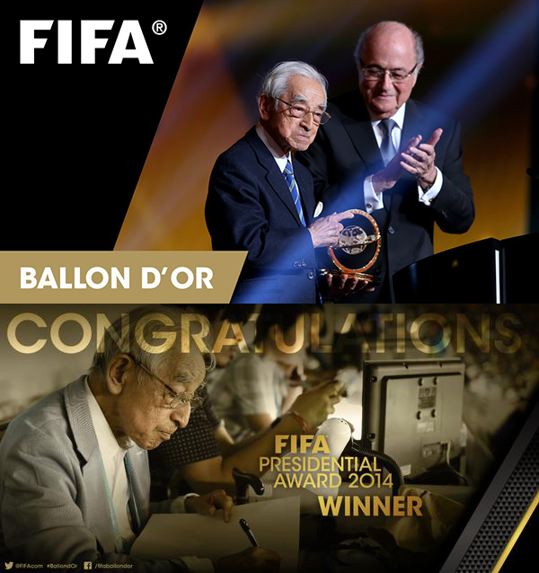 2014년에 브라질 월드컵에 취재를 갔어요. 그 대회에서 내가 가장 나이가 많은 기자였기 때문에 준 것 같습니다. (웃음) 그 당시 FIFA 홈페이지 뉴스에서 저를 취재했고, 그 뒤로 제프 블라토 회장과 이야기를 나눌 수 있었어요. 벌써 90세가 넘었냐며 놀라더군요. 월드컵을 10번이나 취재했고, 유럽선수권과 코파아메리카까지 취재해왔던 것을 알고 나서는 상을 주겠다고 하더군요. 제가 일본에서 활동하는 기자지만 세계 축구를 일본에 전달한 일 등을 전체적으로 평가 받은 거 같습니다.