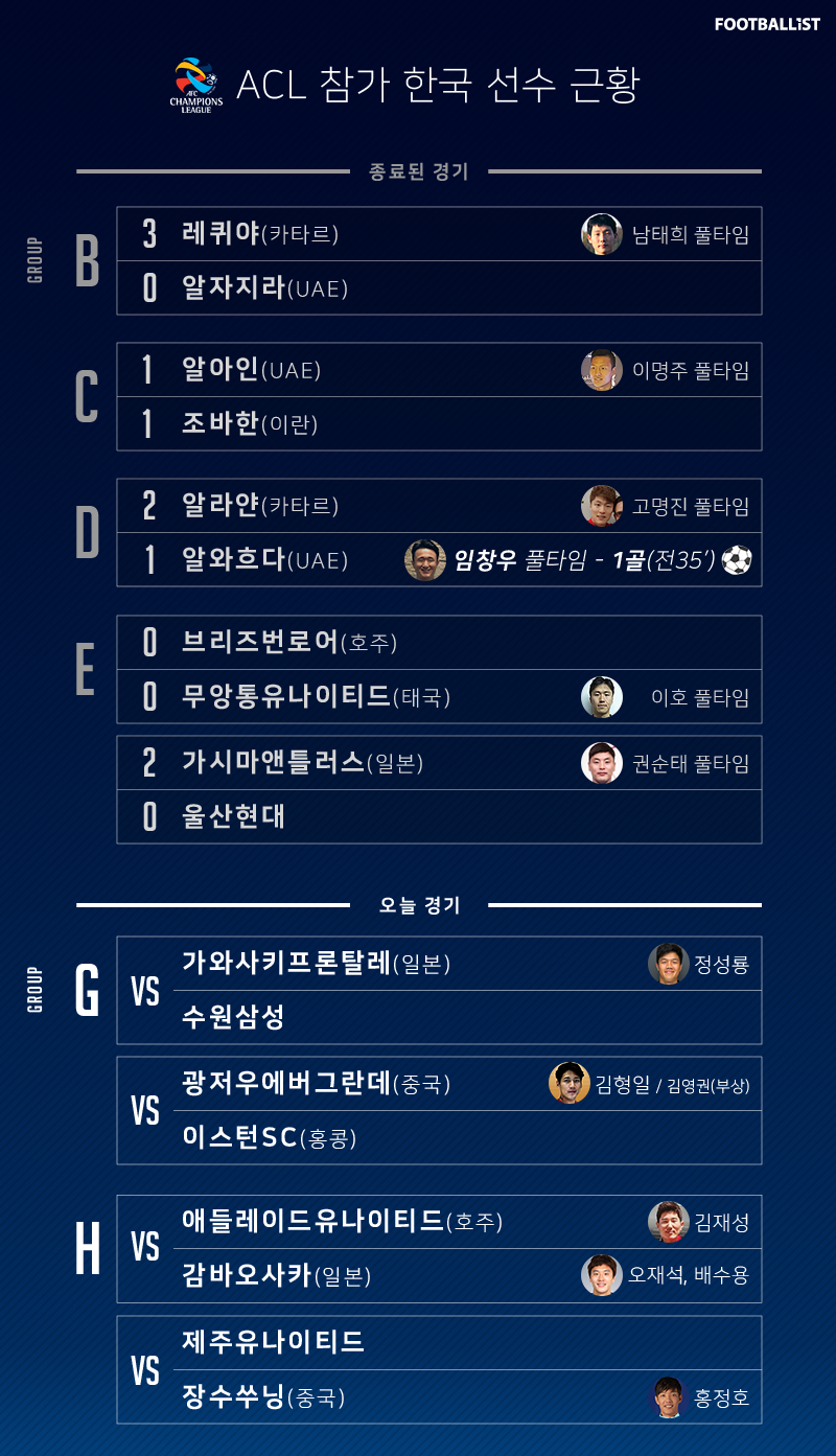 한국 선수들은 타 리그 팀에서도 볼 수 있다. 아랍에미리트연합, 일본, 중국, 카타르, 태국, 호주 등 소속도 다양하다. 먼저 진행된 조별리그 1차전에선 총 6명의 한국 선수들이 출장했다. 남태희(레퀴야), 이명주(알아인), 고명진(알라얀), 임창우(알와흐다), 이호(무앙통유나이티드), 권순태(가시마앤틀러스)다. 모든 선수들이 각 팀에서 풀타임을 소화했다.